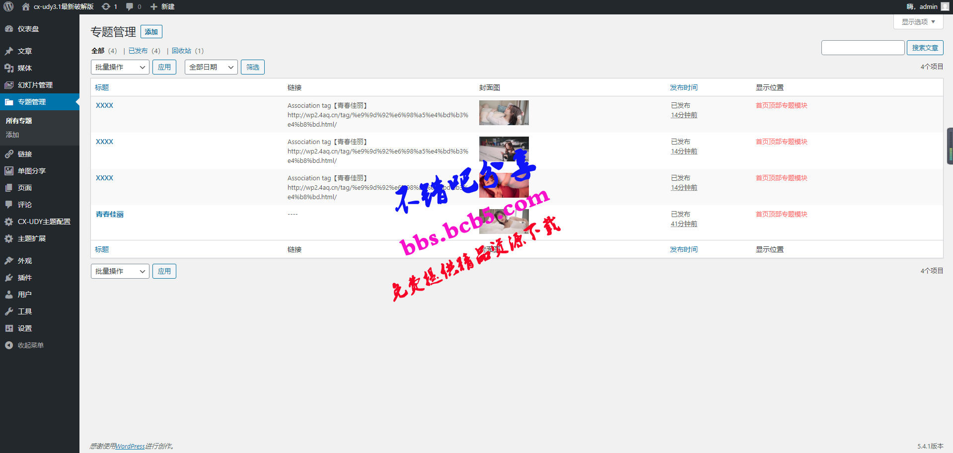 CX-UDY3.1最新破解版全解密去授权版无限制美女图片站【适配】适配新版Wordpress评论框js调用;【增加】增加一种幻灯片UI(左轮播右边显示4个文章位)效果;【优化】优化自动分页与VIP图片或适配的兼容性(部分图片需要VIP才能查看功能支持跨分页使用);【修复】修复部分情况下浏览器占用GPU过高的问题;【修复】修复顶部不吸附的设置下,用户中心logo无法点击的问题;【优化】点卡充值后台可以选择卡号卡密同时验证或者仅输入卡号即可充值;【新增】首页幻灯片下面增加一个广告位;【优化】微信分享二维码改用js脚本生成提高稳定性和节约服务器性能;【优化】底部网站信息统计条支持自定义统计项;【新增】增加商务黑色调配色选择(需安装专用扩展包);Version:3.0.2 – Date:2019-07-11【增加】会员折叠菜单中增加wp后台入口按钮;【增加】双栏布局文章页META栏增加简洁风格,后台可切换;【重构】管理中心会员管理功能重构,支持全字段搜索和会员筛选功能;【优化】LOGO扫光效果增加开关;【优化】优化图片灯箱浏览功能,增加放大缩小和自动播放等功能;【修复】筛选移动端部分设备显示错位问题;【修复】修复筛选逻辑的一个错误;【修复】关闭会员功能是移动端依然显示登录按钮的问题;【修复】修复部分情况下移动端菜单不在顶层的问题;fzz0
