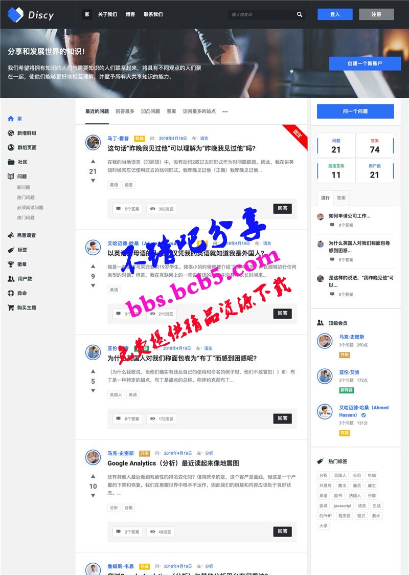 全响应式设计 视网膜就绪 很棒的控制面板 无限侧边栏 无限的颜色 HTML5 / CSS3 页头选项 页脚选项 未登录用户的引导注册 高级帖子/页面选项–自定义背景颜色/图像,自定义颜色,自定义布局(右侧栏,左侧栏,全角),隐藏/显示元素,页面注释等添加问题页面 添加帖子页 不同的样式宽度– 宽度1170px,宽度1330px 左侧菜单的不同样式 文章格式:标准,图片,图库,视频 多个Blog布局中图像,大图像 个性404页 页面模板与定制选项本主题提供给大家学习研究借鉴美工之用,请勿用于商业和非法用途,无任何技术支持!