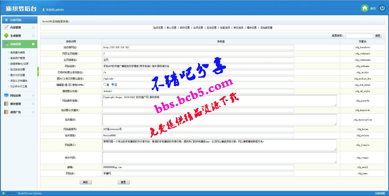 源码简介:第一步:上传源码到宝塔解压,访问域名/install 进行安装第二步:登录后台还原数据。之后点击“系统”-“系统基本参数设置",修改网站根目录地址,填你的域名名,保存(这一步很重要)第三步:还原之后如果不知道登录后台用户名和密码,打开数据库管理找到dede_admin表把里面的userid和pwd修改第四步:点生成管理-->更新主页html(选择生成静态--更新主页html)-->更新系统缓存(点击开始执行)-->一键更新网站(选择更新所有--开始更新)补充:手机模板路径 域名/m 或者用域名绑定这个目录