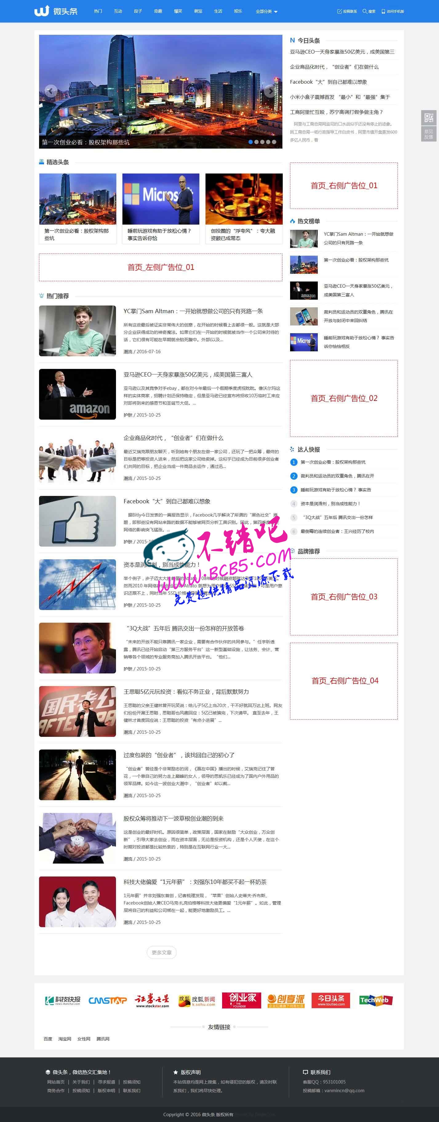 ★模板介绍★ 织梦微头条新闻资讯类dedecms模板(带手机端),测试完整无错,兼容主流浏览器。模板包含安装说明,并包含测试数据。本模板基于DEDECms 5.7 GBK设计,需要UTF-8版本的请自己转换或使用在线转换工具转换。★模板安装方法★1、下载最新的织梦dedecms5.7 GBK版本。2、解压下载的织梦安装包,得到docs和upload/products两个文件夹,请将upload/products里面的所有文件和文件夹上传到你的网站根目录3、安装dede系统。(如果您已经安装,请跳过本步.)直接运行:http://您的域名/install4、将web文件夹内的所有文件夹上传并覆盖到织梦的安装目录;5、登陆后台并还原数据库:1)进入dede后台,找到'系统'-'数据库备份/还原'2)在屏幕右上角点击'数据还原'3)点击屏幕下方的'开始还原'按钮6、确定网站风格(无论是否修改,都点击一下确定):1)点击'系统'---系统基本参数2)将'站点根网址'改为您的网址,如[url]http://www.xxx.com/(本地安装请保持[url]http://127.0.0.1。)3)点击'确定'按钮 7、更新整站缓存:点击'生成'-'更新系统缓存'8、更新网站:点击'生成'-'一键更新网站 '-更新所有-开始更新点击'生成'-'更新主页html'至此,模板安装结束