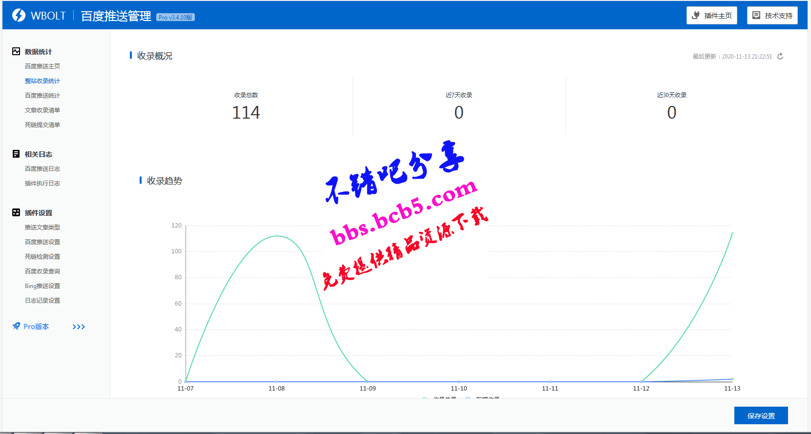 百度搜索推送管理插件V3.4.10是基于百度站长平台对站长开放的链接提交接口开发的,支持站长通过主动推送,自动推送和sitemap推送三种方式,向百度搜索引擎推送链接,提升百度搜索引擎对网站的收录效率本版本对插件底部自带的主题推荐、从而使界面更干净。强烈推荐大家同时使用WBOLT的SEO插件-Smart SEO Tool及热门关键词推荐插件三者结合起来,对WordPress整站SEO优化将会起到意想不到的效果。插件概述百度搜索推送管理插件是一款针对WP开发的功能非常强大的百度搜索引擎收录辅助插件。利用该插件,站长可以快速实现百度搜索资源平台基础收录推送,快速收录推送及网站百度收录数据查询等。目的在于进一步提升网站的百度搜索引擎收录效率,提升网站SEO优化效果;及帮助站长通过该插件了解网站百度收录数据情况,基于数据统计参考进一步对网站内容进行调整与优化。百度搜索推送管理插件包括三大功能模块:1. 数据统计模块整站收录统计-支持快速查看网站的收录总数、最近7天收录及最近30天收录数据概况,及最近7天&30天的收录趋势折线图。百度推送统计-支持快速查看百度搜索资源平台普通收录及快速收录推送最近7天&30天的推送数据走势。Bing推送统计-支持查询Bing推送剩余配额,成功推送及推送失败数据,并提供近7天和近30天的自动推送、手动推送和剩余配额的数据图表。收录文章清单-支持按未收录或者已收录状态筛选查看网站文章列表,以便于站长快速了解网站的文章收录情况。收录文章清单采用了闪电博团队自主研发的百度收录状态查询API接口,能够高效率地处理整站文章的收录状态查询工作,并且准确率更高。站长还可以即时查询文章百度收录状况及搜索引擎蜘蛛爬取该文章的历史记录,以便于对搜索引擎收录做进一步的分析。其中文章蜘蛛历史查询依赖Spider Analyser插件,需安装启用该插件才可以调用相关数据。死链提交清单-支持读取Spider Analyser-蜘蛛分析插件的404状态网站死链数据,并以列表的形式展示URL地址、响应码状态、检测时间及操作项等,并支持站长下载死链链接列表提交至百度搜索资源平台执行删除,以免影响网站的站点评级。2. 推送日志模块推送日志模块包括百度推送推送、Bing推送及插件执行日志,站长可以通过该功能模块查看最近7天推送URL和推送状态,插件执行日志将会记录输出插件执行的相关任务记录,以方便开发者快速定位插件问题。百度推送日志-支持查看百度普通收录推送及快速收录推送相关日志,日志列表包括推送日期、推送链接及推送状态,并支持一键清除日志。Bing推送日志-支持查看Bing手动推送及自动推送相关日志,日志列表包括推送日期、推送链接及推送状态,并支持一键清除日志。插件执行日志-该功能主要用于站长快速查看插件执行的收录推送、定时任务、收录查询、收录概况等插件相关执行日志记录,以便于快速定位排除插件问题。3. 插件设置模块推送文章类型-支持站长自定义不同的文章类型,推送至百度搜索;百度推送设置-支持站长填入百度推送API接口调用地址,实现百度普通收录自动推送、主动推送、快速收录推送及Sitemap推送。主动推送-支持博主通过配置百度主动推送准入密钥,主动向Baidu提交网站新增、更新和删除内容URL。并且可查看最近三十天的推送数据及推送错误日志。自动推送-支持站长开启百度普通收录的自动推送功能,启用该功能后会网站页面添加百度搜索资源平台官方的自动推送js代码,同时启用插件的自动推送数据统计等功能。快速收录推送-即原有的天级收录推送功能,内容享受快速抓取校验、快速搜索展现。快速收录推送的效率远高出百度搜索资源平台的普通收录推送,只要你的文章内容原创度足够高,一般能够快速校验收录。目前仅优质内容网站,原来熊掌ID天级收录有配额或者提交小程序的网站具备快速收录配额。Sitemap推送-Sitemap推送功能也是百度站长URL提交功能之一,本插件只实现读取WordPress博客sitemap生成状态,方便博主快速复制Sitemap地址,到百度站长平台提交sitemap地址。最新版本的sitemap文件检测已兼容更多的Sitemap插件,包括All in One SEO Pack, SEOPress, Yoast SEO, Google XML Sitemaps等。死链检测设置-支持死链检测设置启用或关闭操作,及Spider Analyser插件安装启用检测。百度收录查询-启用该功能后,插件将会在文章列表新增已发布文章增加百度收录状态显示项、百度收录查询入口及未收录链接提交选项,方便站长快速了解发布文章的百度收录情况。同时,收录文章清单依赖此功能,如需要使用到收录文章清单功能,切勿关闭此选项。Bing推送设置-支持配置Bing推送API密钥及启用关闭Bing自动或手动推送功能。日志记录设置-支持按24小时、3天及7天保留推送日志等数据,默认设置项为7天。功能特色百度搜索推送管理是一款适用于站长管理WordPress博客内容URL的百度推送管理,其中包括:主动推送-支持博主通过配置百度主动推送准入密钥,主动向Baidu提交网站新增、更新和删除内容URL。并且可查看最近三十天的推送数据及推送错误日志。自动推送-支持博主直接开关按钮来配置百度主动推送功能。自动推送是百度搜索资源平台为提高站点新增网页发现速度推出的工具,安装自动推送JS代码的网页,在页面被访问时,页面URL将立即被推送给百度Sitemap推送-Sitemap推送功能也