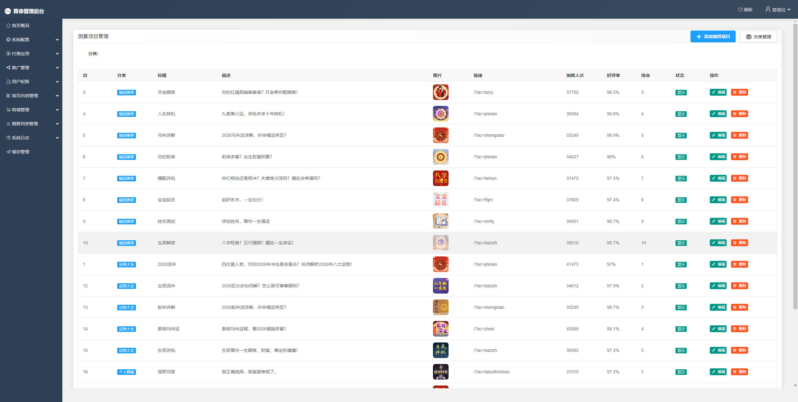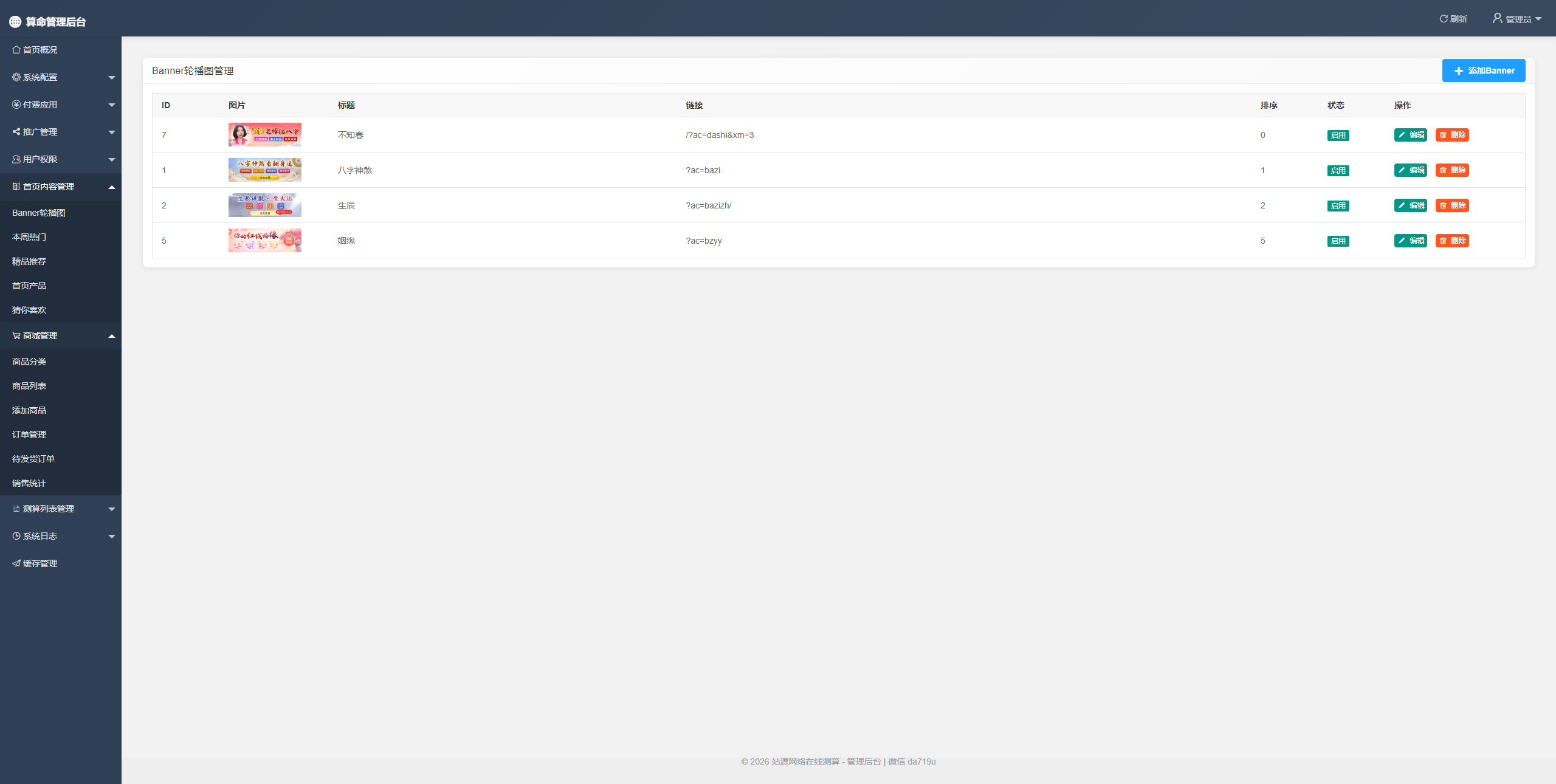 2026年更新后台框架改用layui 更加稳定 美观前端首页后台可控制项目 图片新增商城功能更新马年运势模板/八字神煞/八字终身运/新增塔罗问答模板新增个人运势免费查看新增择吉日(结婚吉日/订婚吉日/领证吉日/搬家吉日/开业吉日/入宅(迁新居)吉日/装修吉日/出行吉日/开工吉日/买车/提车吉日/动土吉日/提亲吉日/买房吉日/理发吉日/签约吉日)