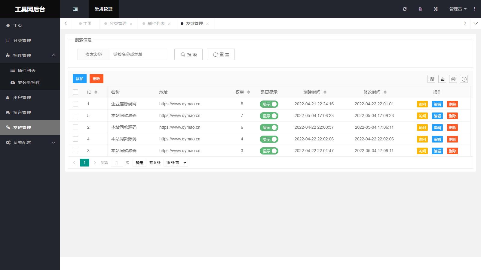 是一个多功能性工具程序支持后台管理、上传插件、添加增减删功能。
