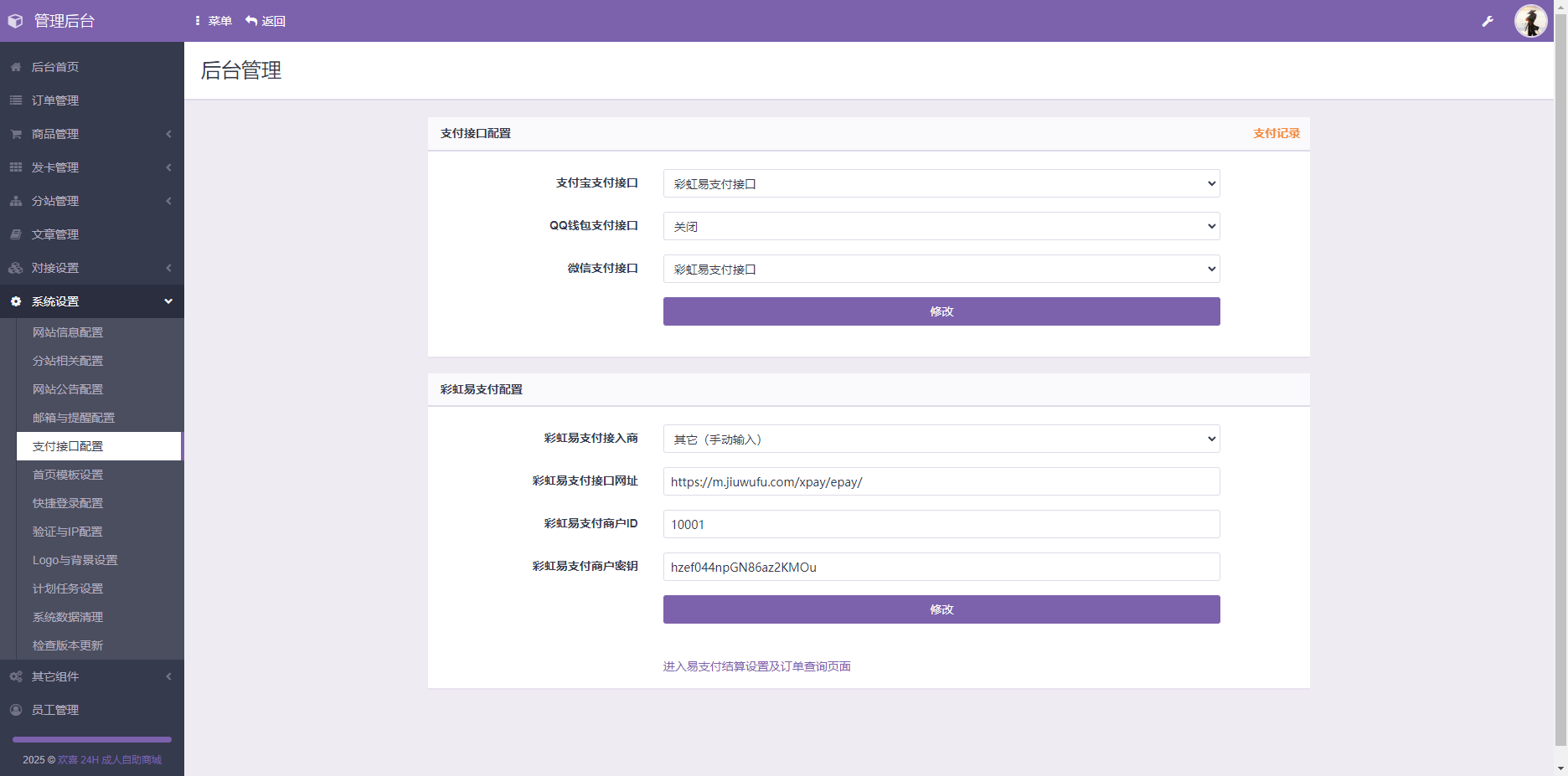 这套源码用的彩虹发卡程序,功能还是挺多的,支持开通分站,下单邮箱提醒,后台有 20 套前台模板,也可以改做其他站点测试环境:PHP7.4,Mysql5.7支付对接的是微信/支付宝官方支付,也可以对接第三方易/码支付,框架用的是thinkphp搭建环境:nginx1.24.0·1、源码解压至根目录·2、配置伪静态think PHP3.修改config.php数据库信息·4.导入数据库文件5.后台:域名/admin账号:admin密码:123456