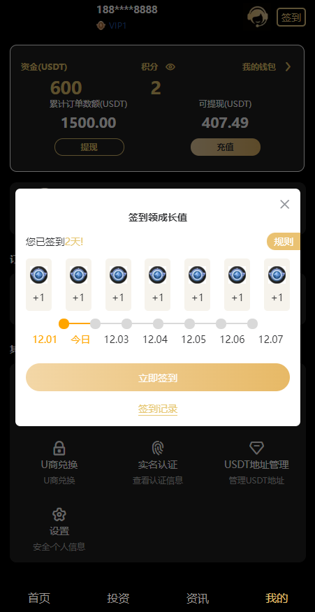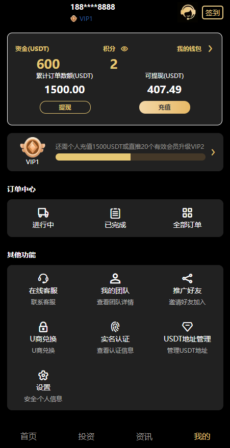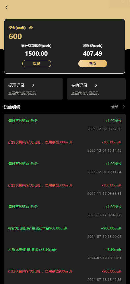 有签到、积分商城、团队推广,冲提都是USDT,带有一个搭建部署文件