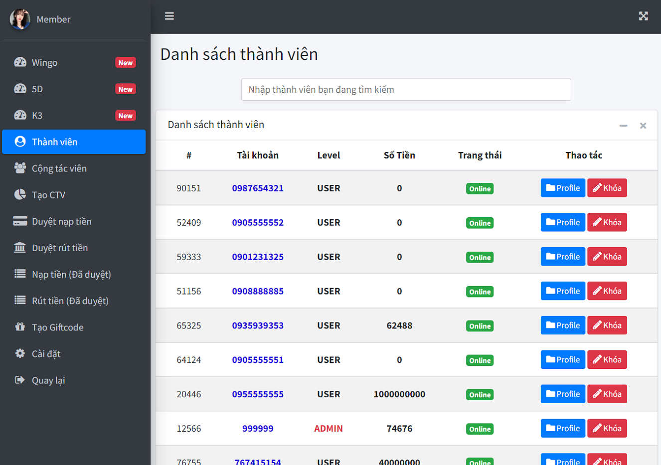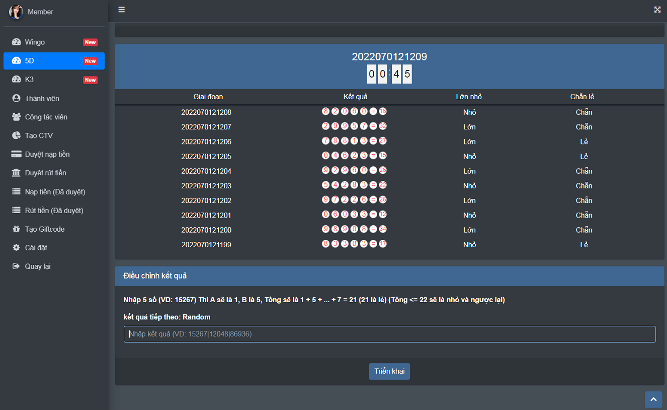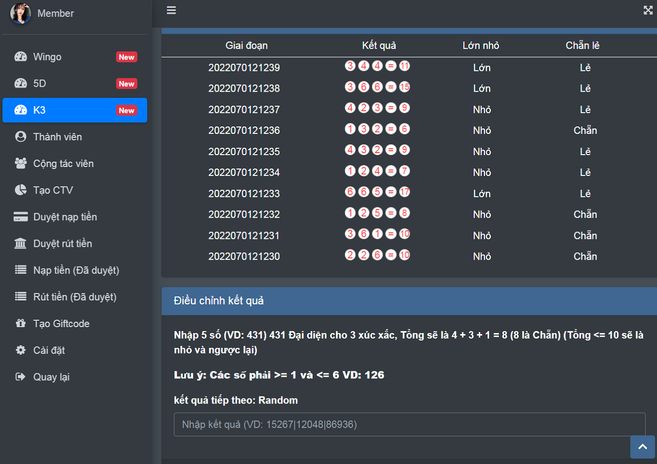 内有三款游戏:WIN GO,越南5D彩,越南快3,均可控制开奖结果。