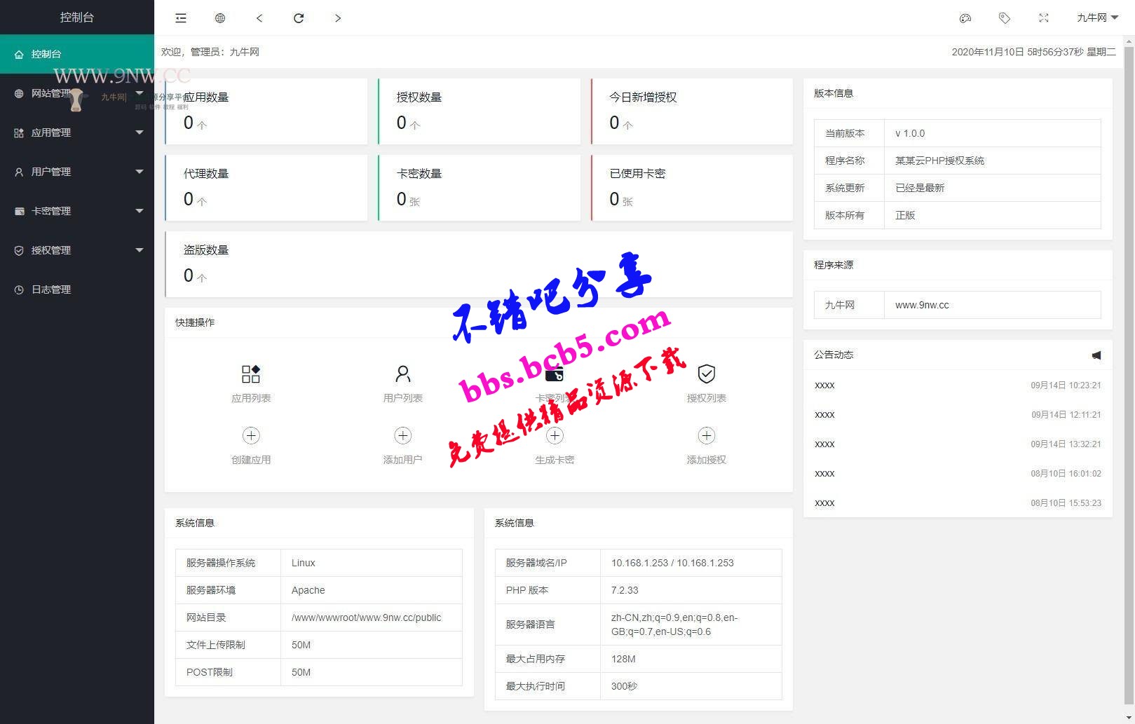授权参考SDK /public/demo/SDK.PHP授权提示修改 /app/api/controller/ApiController.phpAPI设置域名后就需要改成[url]http://xxx.xx/v1,PHP >= 7.1.0需要pdo、ZipArchive、curl源码说明:本程序支持多应用添加;后台可以单独设置后台域名,用户中心域名,首页域名,API域名;支持自行控制是否只需要授权主域名,还是字域名都要授权;添加应用,支持自行输入名称,作者,团队名称,客服QQ,官方网址等等;支持卡密生成授权;支持三级区别,一级权限:可以生成卡密授权,以及可以添加,二级,三级代理;二级权限;可以生成卡密授权,可以添加三级;三级权限;只可以后台授权;前台支持授权查询,卡密在线授权,代理查询,一级应用列表;下载源码支持授权QQ扫码下载;