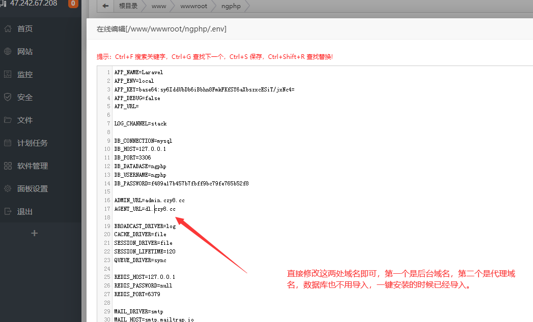 4、修改源码根目录下的.env文件的后台域名和代理域名