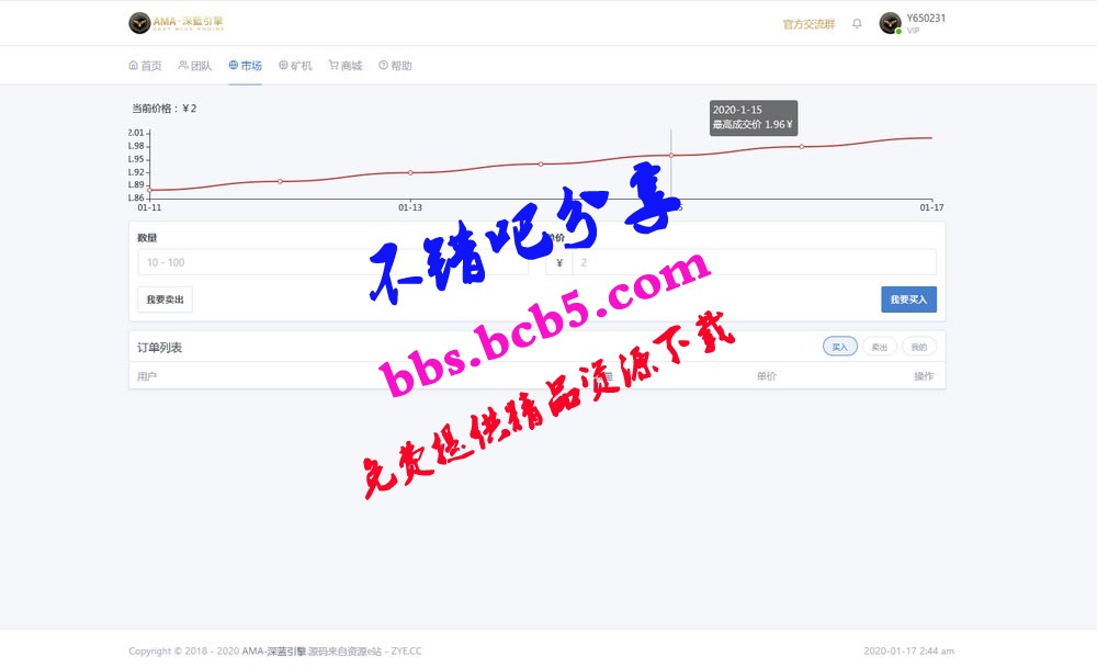 Thinkphp5网易星球章鱼星球GEC挖矿系统区块链虚拟币交易源码修复版运行环境PHP5.6+MYSQL5.5+APACHE+伪静态修复日志:2018.12.10更新增加聚合数据短信接口2018.11.19更新增加短信宝接口2018.08.17修复Linux系统搭建验证码不显示问题2018.08.09修复后台某处溢出数据库账号密码BUG 2018.08.06修复票卷BUG 源码介绍:区块链系统中用户共九个等级,依次从Lv0、Lv1、Lv2到Lv8Lv0:您新注册的用户Lv1:实名认证后然后从Lv2起,一直到Lv8,升级条件是可以自定义的【升级条件】比如从Lv1升级到Lv2,升级条件可以设置成:要求:直推人数多少要求:总算力达到多少要求:团队中Lv1级别的用户有多少、团队中Lv2级别的用户有多少、一直到Lv8,都可以分别设置要求:直推Lv1级别的用户有多少、直推Lv2级别的用户有多少、一直到Lv8,都可以分别设置要求:团队总人数多少【升级奖励】可奖励的有矿机、可用货币、算力【挖矿收益】情况一:假如A推广了B,B购买了矿机,那么B在每次收矿的时候,A能获取到部分比例的利润情况二:假如A推广了B,B推广了C,那么C再每次收矿的时候,AB都能获取到部分比例的利润以上两种情况中,是否能够获取到利润,可自定义,能够获取到多少利润,也可以自定义【交易收益】情况一:假如A推广了B,B成功卖出了货币,那么A能在手续费中获取到部分比例的利润情况二:假如A推广了B,B推广了C,C成功卖出了货币,AB都能在手续费中获取到部分比例的利润以上两种情况中,是否能够获取到利润,可自定义,能够获取到多少利润,也可以自定义【矿机】矿机有几个重要参数,运行周期、总收益、等级假如小型矿机价值90个货币,运行周期为10个小时,总收益为100个货币,那么用户每小时可领取10个货币,最终利润为10个货币如果该矿机的等级为0,那么购买该矿机的用户在收矿的时候,他的上级无法获取到利润如果该矿机的等级为1,那么用户的收矿的时候,他的直接上级能获取到利润(也的看该上级当前等级的配置里是否有挖矿收益设置)如果该矿机的等级为2,那么用户的收矿的时候,他的直接上级和他上级的上级都能获取到利润(也的看上级当前等级的配置里是否有挖矿收益设置)以此类推,最多到8【算力】 矿机的产出收益和算力没有任何关系假如一台大型矿机价格90个货币,运行周期为10个小时,总收益为100个货币,算力90那么这台矿机能够带给用户最多的收益为100个货币算力,在这里没有起到任何作用他的作用有两个地方,一个用于升级条件,一个用于共享矿池一:用于升级条件假如平台赠送给用户升级奖励的矿机并不附加算力,那么该用户不推广下级的话,他的账号理论上是永远不会有算力的在这个基础上,如果商城里购买的矿机是赠送算力的,那么每一个有算力的人,代表着他或他的下级是有进行过消费的用户这意味着每一个有算力的用户,是对平台发展有益的用户,因为要么他自己买过矿机,要么他拉的人买过矿机了解了这个概念,那么算力在升级条件里起到了什么作用呢比如我自己注册一个主账号,利用N个手机号注册一大批小号,此时,如果升级条件中没有设置算力要求【imToken】imtoken是一款APP,用户可以在这个APP上进行虚拟货币转账,但这些虚拟货币都是被全球认可的,例如**,以太坊等等管理员需要自己下载好imtoken的APP,自己注册账号,得到了自己的imtoken的钱包地址和二维码,然后上传到我们系统充值用户在前台点击imtoken,选择充值,输入货币数量,提供他在imtoken上转账给你的截图,然后提交管理员在自己的imtoken的APP上查看到用户确实转账给了自己,再到后台看用户转账给你的【主流货币】和他要充值的【平台货币】价格是否相等如果相等,点击同意,用户平台账户上的货币会增加提现用户在前台点击imtoken,选择提现,输入货币数量,提供他在imtoken上的钱包地址和二维码管理员在后台看到用户的提现申请后,在自己的imtoken APP上给他的钱包地址转对应的货币,然后点击已转账,用户账上将会扣除对应货币【默认推广制度】未认证用户:注册就是初级矿工:实名认证就是,可得1代交易及挖矿时1%的收入中级矿工:直推5人,团队总人数20人,可得1代1%,2代0.1%高级矿工:直推20人,团队总人数80人,可得1代1%,2代0.1%,3代0.01% 初级矿商:直推80人,团队总人数320人,可得1代1%,2代0.1%,34代0.01%,奖励贵宾矿机一台中级矿商:直推320人,团队总人数1280人,可得1代1%,2代0.1%,345代0.01%,奖励贵宾矿机一台高级矿商:直推1280人,团队总人数5120人,可得1代1%,2代0.1%,3456代0.01%,奖励贵宾矿机一台创业经理:直推5120人,团队总人数20480人,可得1代1%,2代0.1%,34567代0.01%,奖励贵宾矿机一台国际大使:直推20480人,团队总人数88888人,可得1代1%,2代0.1%,345678代0.01%,奖励贵宾矿机一台【贵宾矿机】周期2160个小时,也就是3个月,总计收益10个货币【共享矿池】好比一个饼,有能力的人都能去吃一口,越早吃,嘴越大的人,吃得越多假如后台配置矿池内货币余量为100个,那么拥有算力的人,每隔一段时间就能去挖一次,可以得到若干数量的货币正常得到货币的方式要么是买矿机挖矿,要么是和别人交易买货币,要么通过下级的交易、收矿得到但如果你推荐了很多人,他们给你带来了算力,那么你不需要花一分钱,就可以在共享矿池里根据算力来得到货币计算公式:1 – (已领总矿 / 矿池总量) = 已领比例(保留最多8位小数)用户总算力 * 已等待秒数 * 收益比例 * 已领比例 = 最终收益