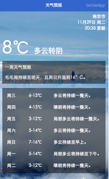 天气预报小程序源码,天气类微信小程序源码。API使用的是和风天气。可以提供实时全国天气气象信息,及时发布天气预报、灾害预警、气象云图、旅游天气、台风、暴雨雪等气象信息,为我国的生产生活提供全面精确的气象服务。