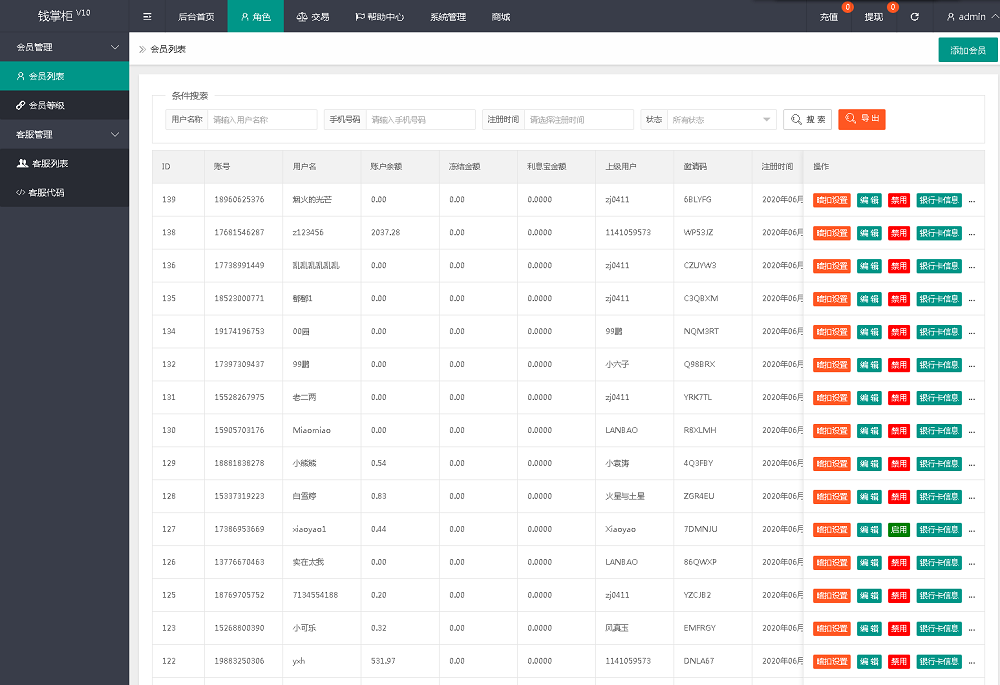 新增后台客服权限 后台可添加客服管理员 客服管理员的权限只有 充值列表 提现列表