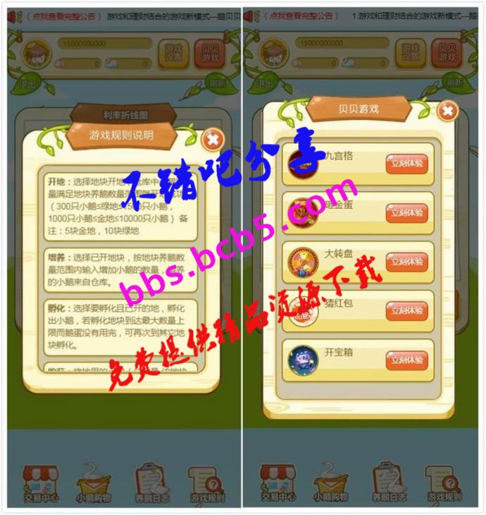 最新鹅贝贝理财拆系统开源版完整源码分享,完美运营含商城系统+九宫格+砸金蛋游戏功能,可以通过购买动物来饲养,生产,收获,出手,偷取,升级,签到,收益的游戏源码。安装说明:上传源码至根目录,导入数据库。修改数据库配置信息:administrator/conn.php后台地址:域名/administrator玩法介绍:①新买蛋注册的会员提供一个“实习孵蛋房”进行实习和学习,该房仅孵化注册时首次买到的即时成交的种蛋(1一10只)只要在7天之内本人签到一次和徒弟帮加温一次即可成功孵化!②饿鹅急救规则:对于前一天因自身原因忘记喂食而被饿昏的鹅,可在当天通过购买“急救包”(每只鹅0.5元菜票)拯救回来(不能超过一天)。③为照顾更多用户能参与进来,每人每天限购额50只蛋和50只鹅。新玩家进场购买十个DanDan不受时间限制(最多10个)新玩家实习孵化房,7 天内,本人签到一次,徒弟帮加温一次,就可以孵化成功JiJi交易卖出。老玩家要提前充值好菜票,9点1秒准时开抢,每个微信号限定50鹅,50蛋,手快挂单才有,手慢了又等明天哦老玩家买到DanDan的先开好蛋房放蛋孵化,自己签到加温,发二维码让徒弟帮忙加温,(7天,每天各一次),一个徒弟可加温5间蛋房500蛋。老玩家买到JiJi的一定要及时加鹅放进农场,买足饲料,每天喂饱一次,不用徒弟帮忙。(打开我的财界面所有操作有红色警示,红点消除那表示所有操作己完成)。记录可查是否有饿鹅。每天记得喂鹅,忘了会饿坏鹅又要医治(麻烦),切记只要和朋友分享“鹅贝贝”,如下奖励属于你的!1:成为徒弟(只要买鹅或蛋就成为徒弟啦)①孵蛋卖鹅有钱赚,②养鹅卖蛋有钱赚。2:成为师傅:(扫你二维码的人买了鹅或蛋你就升级为师傅啦)①徒弟卖鹅、卖蛋,交易额的1%。②徒弟买道貝(饲料)10%。3:成为师爷(徒弟、徒孙加起来有300人你就是师爷啦!)①徒弟、徒孙交易额的1%。②徒弟、徒孙们买道貝(饲料)5%。4:成为盟主(你有10个徒弟成为师爷,你就是3000人以上团队的盟主)①徒弟徒弟们交易额的1%。②徒弟徒弟们买道具(饲料)2%。